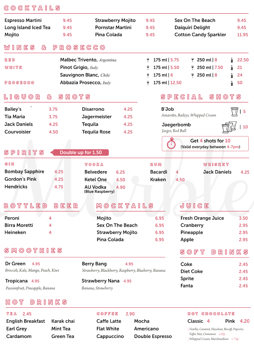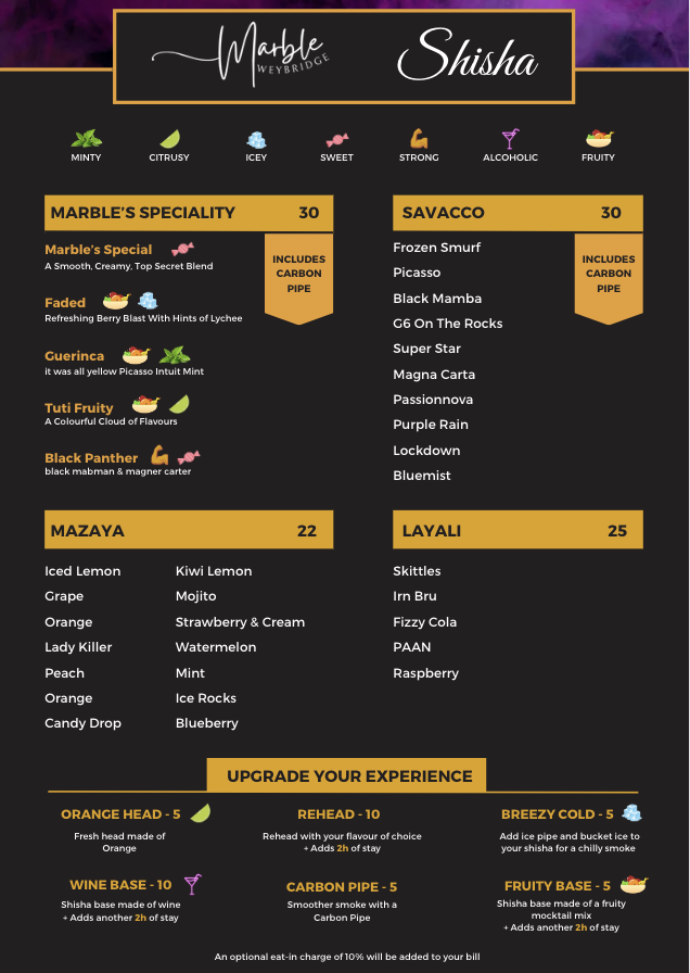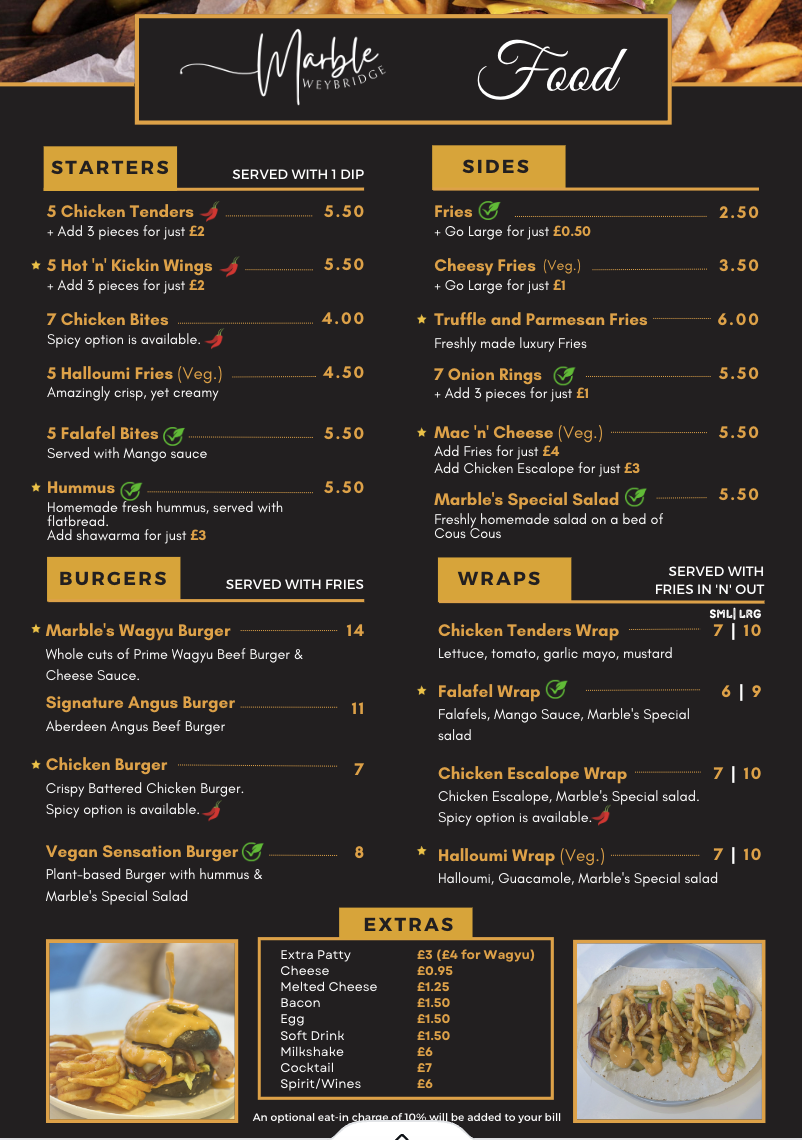 At Marble Weybridge, dining is more than just a meal-it’s an experience. The menu offers a delightful blend of modern British cuisine, where traditional flavors meet contemporary twists. Whether you're in the mood for a hearty main dish, a light starter, or a comforting dessert, every bite is crafted with care using the finest ingredients. From expertly cooked meats to fresh, vibrant vegetables, each dish promises something special. With a selection of drinks to complement your meal, including a curated wine list, there’s something to suit every taste. Whether you’re celebrating a special occasion or enjoying a casual dinner, the Marble Weybridge Menu ensures a memorable dining experience that leaves you coming back for more.